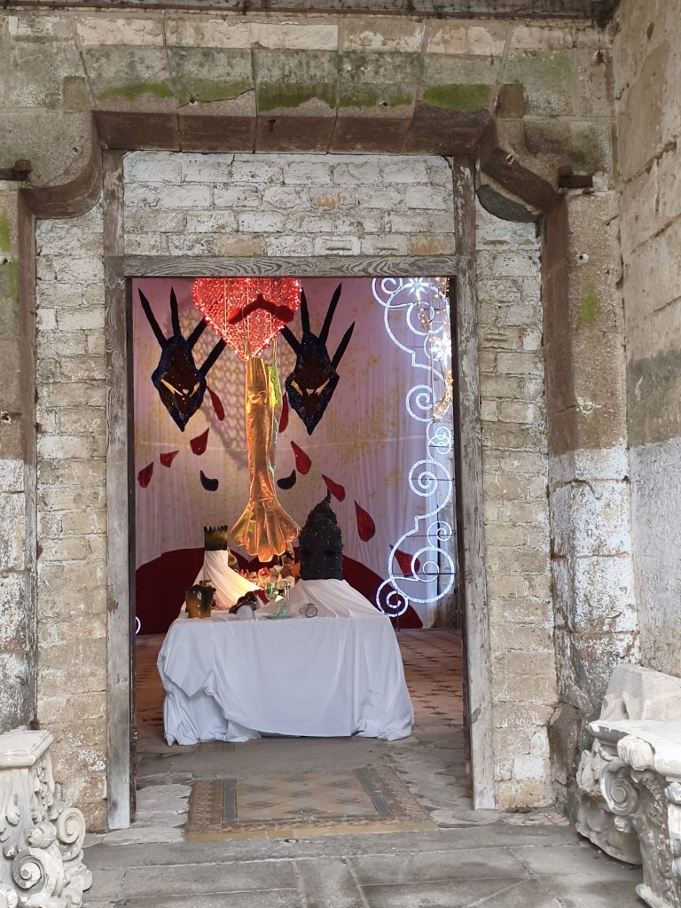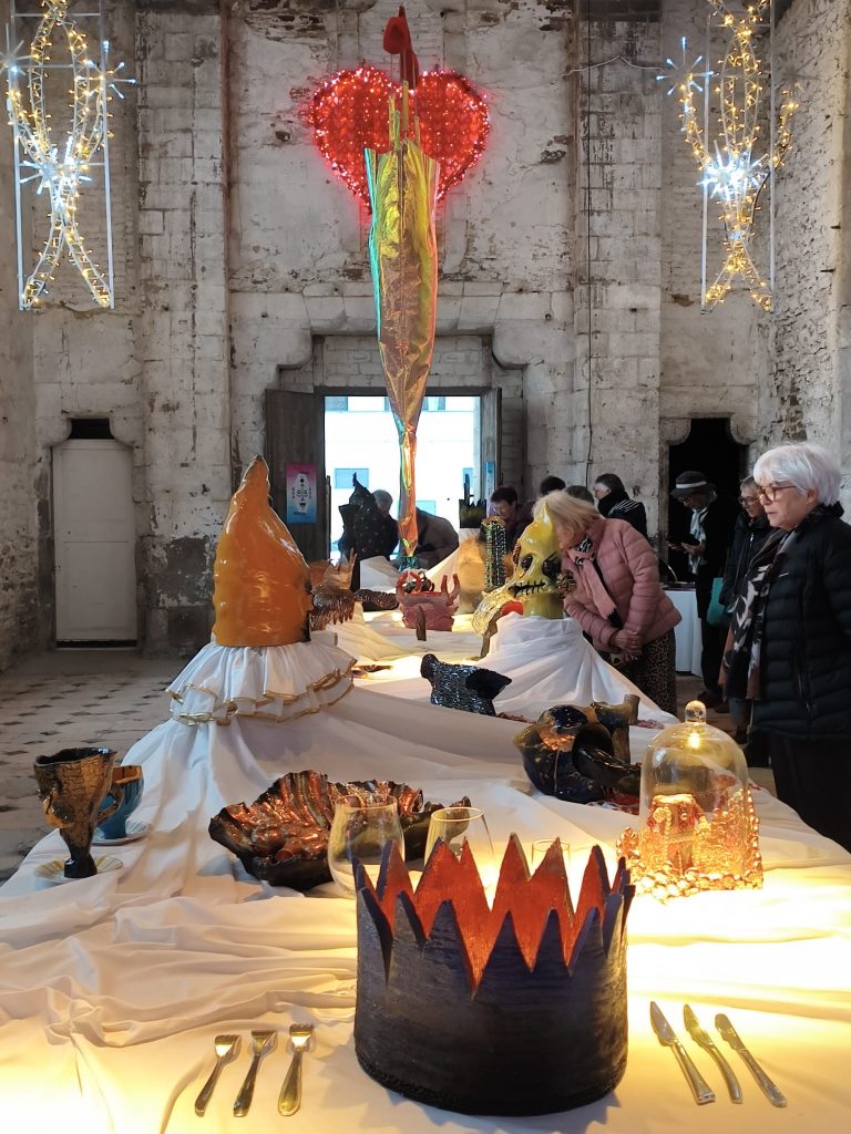 Sous la charpente d’une église désertée, une longue tablée se déploie. Drapée de tissus et dressée de céramiques aux formes organiques, elle compose le décor d’un banquet fantomatique. Ne subsistent que les résidus d’une célébration passée ou à venir, indices silencieux d’une présence humaine. Au bout de la table, derrière un socle, se dresse un grand rideau dévoilant une bouche ouverte.