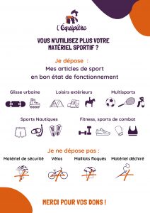 Nous installons un bac au Centre des Longs Prés : du 8 au 26 septembre pour vous permettre de faire don de vos équipements sportifs inutilisés encore fonctionnels. Ils seront ensuite revalorisés et proposés dans la boutique, dans une démarche d’économie circulaire.