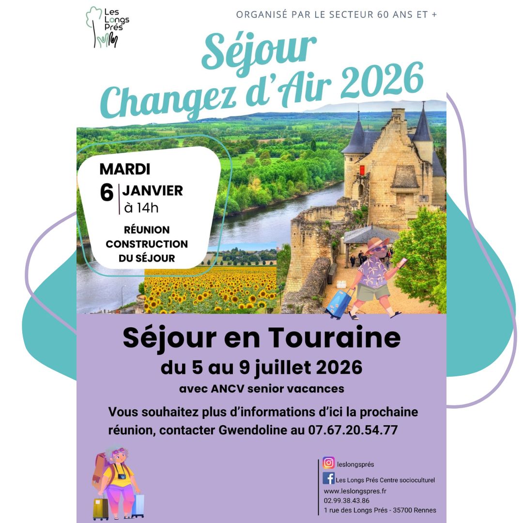 Cette saison pour le séjour « Changez d’air », nous irons direction la Touraine du 5 au 9 juillet 2026 (séjour avec ANCV senior vacances).